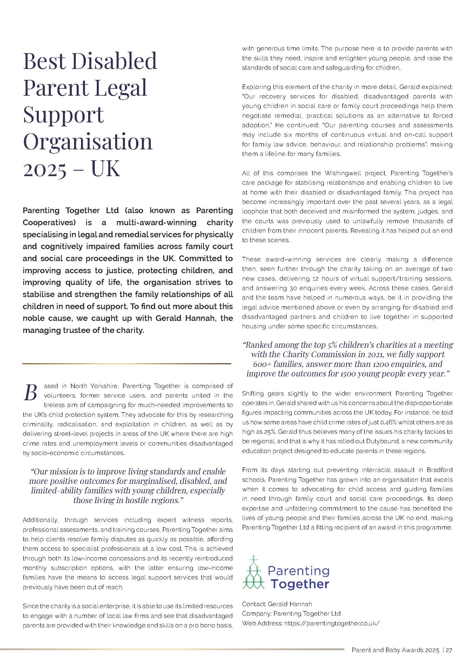 What Gerald has achieved is a reminder that anything can be achieved with the right mindset, knowledge and a determination to always provide a great service. Gerald embodies the spirit and actions of a modern business leader. The fact that he has been able to work so effectively with such a diverse range of clients from different backgrounds over so many years is something that is very rare and says a great deal about his unique skill set. He’s showing no signs of slowing down anytime soon and it’s clear that there are many chapters yet to be written in both the Gerald Hannah and Parenting Together story. For more information visit www.parentingtogether.co.uk